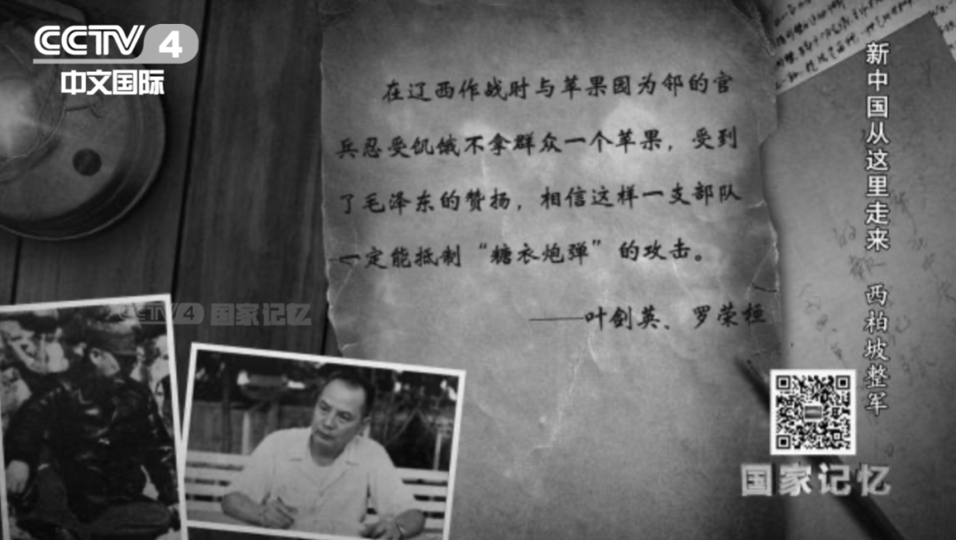 在发给中央的报告中,叶剑英和罗荣桓是这样写的:“在辽西作战时与苹果园为邻的官兵忍受饥饿不拿群众一个苹果,受到了毛泽东的赞扬,相信这样一支部队一定能抵制‘糖衣炮弹’的攻击”。
