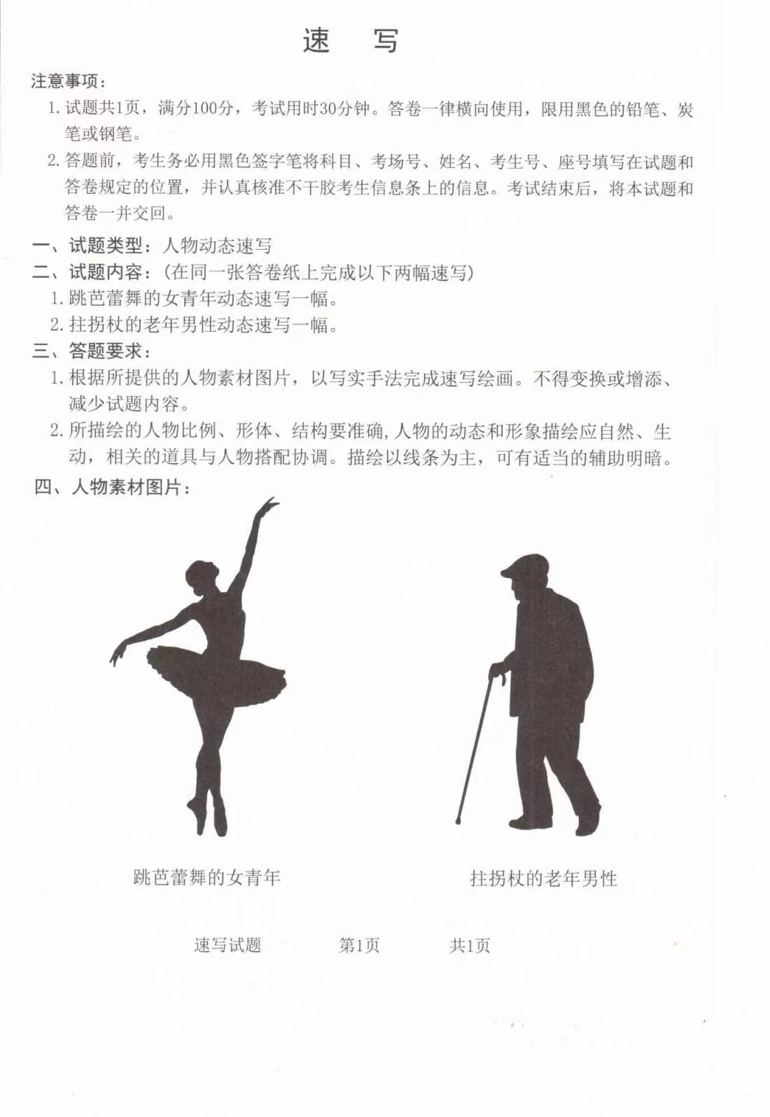 2023年速写试题给出的人物素材图片为跳芭蕾舞的女青年和拄拐杖的老年男性剪影。在陈嵩看来,速写试题变化较小,相较前两年难度略有降低。“2021年速写在两个人物的基础上,要求有人物组合关系,同时其中一个人物的道具较为复杂,2022年速写则对人物的站立重心有明确要求。2023年速写的两个人物延续了前几年的出题模式,一个运动类,一个为常规类,道具相对简单,对人物关系也没有提出组合、联系的要求。”陈嵩介绍,其中运动类人物主要考查考生对人物动态、比例、肌肉、骨骼以及体块的理解,常规类人物则要注意题干中“不能变换或增添、减少试题内容”的要求,例如老人的拐杖就不能遗漏。“考生想要拿高分一定要注意对人物头手脚的刻画,对衣服褶皱纹理的处理,呈现生动的速写语言。”