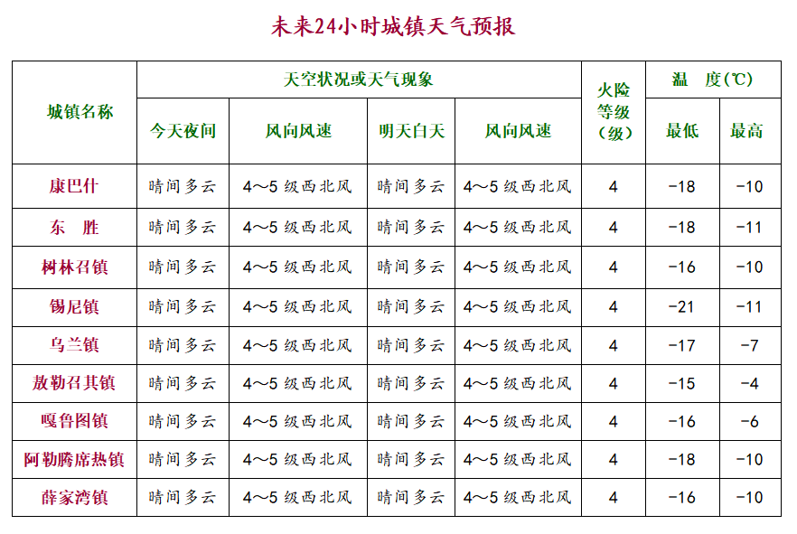 预计今天夜间到明天白天,我市大部地区晴间多云,4~5级西北风,气温继续下降6℃左右;最低气温:-21~15℃,最高气温:-11~-4℃。