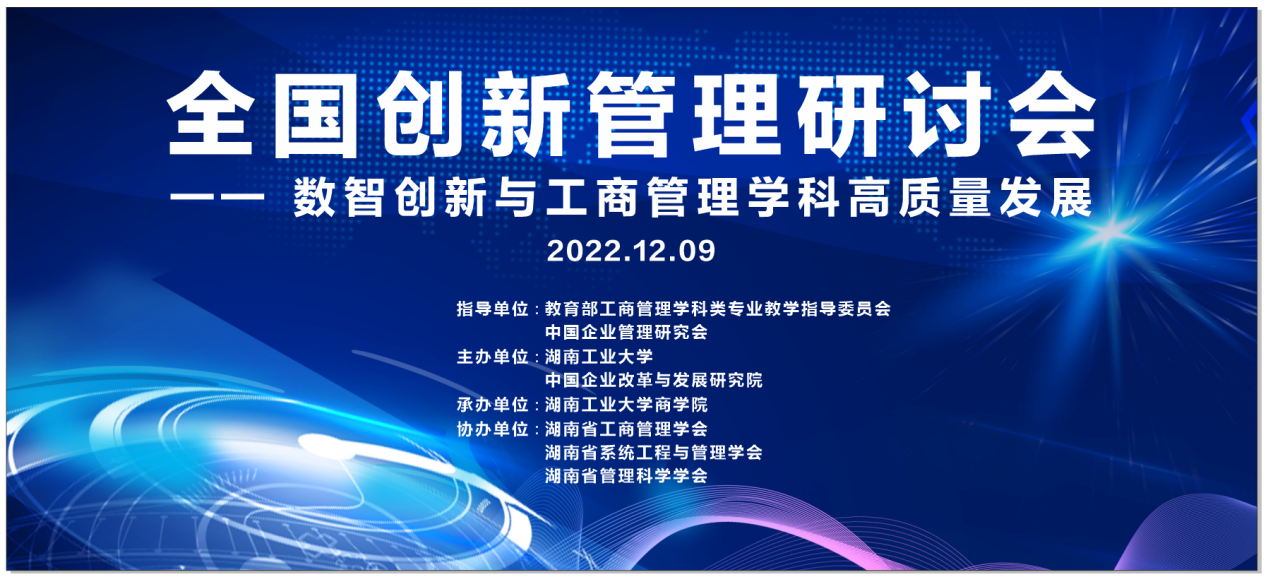 2022年12月9日,由教育部工商管理学科类专业教学指导委员会和中国企业管理研究会指导,湖南工业大学和中国企业改革与发展研究院共同主办、湖南工业大学商学院承办,湖南省工商管理学会、湖南省系统工程与管理学会和湖南省管理科学学会协办的“全国创新管理研讨会--数智创新与工商管理学科高质量发展”学术研讨会在湖南工业大学举行。会议采用线上线下相结合的方式进行,来自西交利物浦大学、中国企业管理研究会、江西财经大学、首都经济贸易大学、华侨大学、华中科技大学、西安交通大学、中央财经大学、福州大学、广西师范大学、浙江大学、湖南大学、中国科学院、中国科学院大学、上海对外经贸大学、北京师范大学、河南大学、云南大学、湖南工业大学等全国有关高校和科研院所专家、学者共聚“云”端,围绕“数智创新与管理变革”、“数智赋能与新商科人才培养”、“数智突破与治理重构”、“数智实践与新商科教育创新”分享最新研究成果,共同探讨数智创新和工商管理学科高质量发展。会议同步开通微信线上直播,社会反响热烈,据悉,在线直播观看人数峰值超过了13000人。