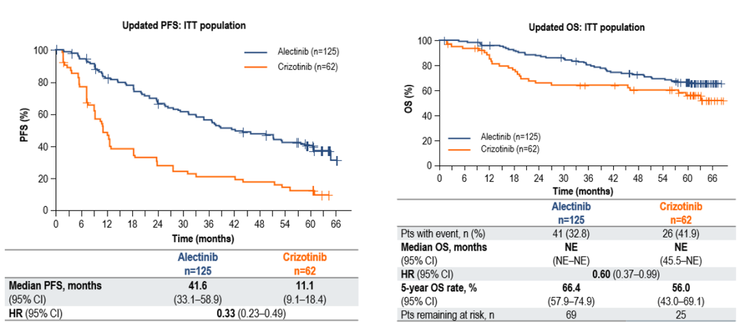 图5 ALESIA研究,阿来替尼组与克唑替尼组PFS、OS数据对比