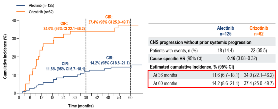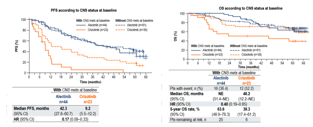数据显示,阿来替尼可降低脑转移发生和进展的风险。至数据截至时间2022年5月16日,在基线无脑转移的患者中,阿来替尼组CNS转移的发生率为14.4%,低于克唑替尼组。对于基线有脑转移的患者,与克唑替尼相比,阿来替尼组的中位PFS、5年OS率分别为42.3个月、63.6%,患者颅内获益显著。