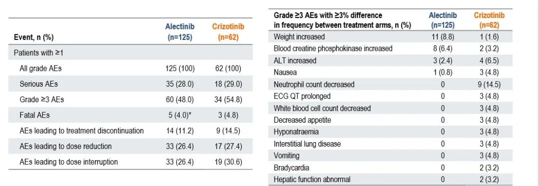 图8 ALESIA研究阿来替尼组与克唑替尼组安全性数据对比