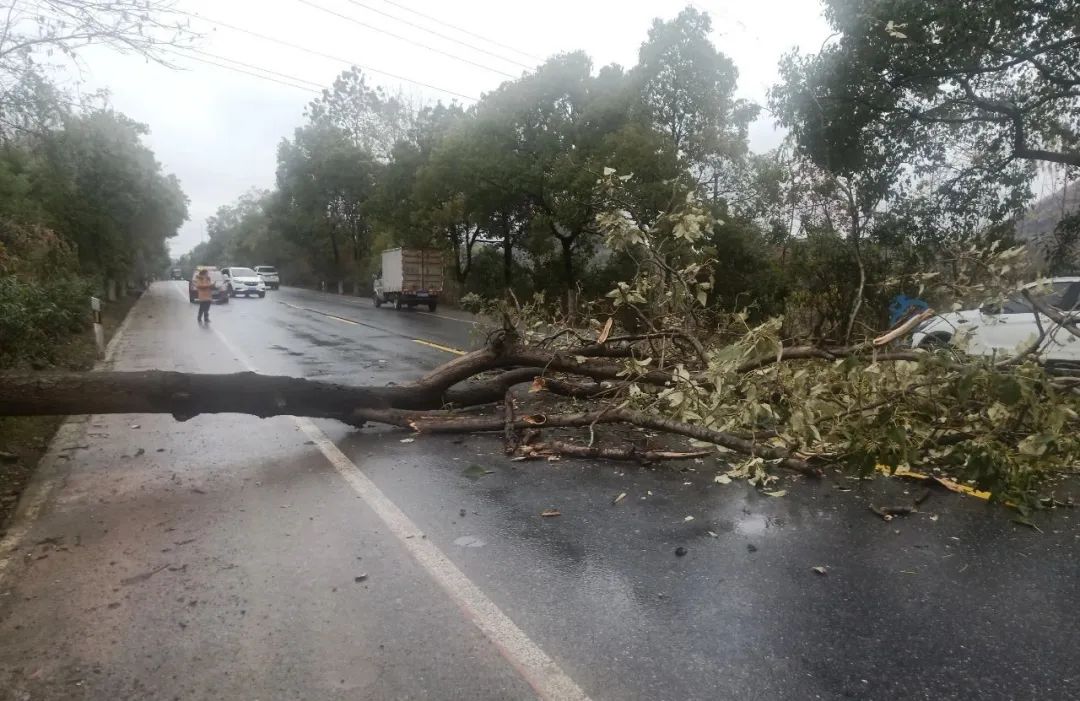 12月1日下午3时许,新圩派出所值班民辅警工作巡查至新圩镇加油站桂江石化公路段时,发现一棵因雨雪天气而倒塌的树横在公路上,造成车辆无法通行,严重影响来往车辆的通行安全。
