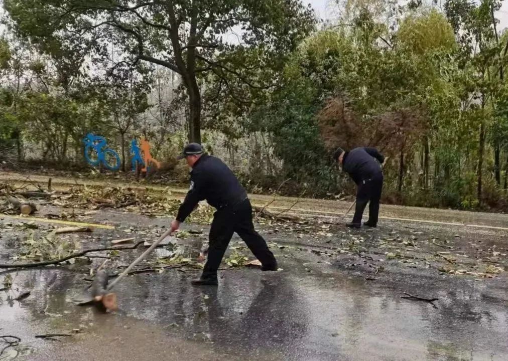 新圩派出所值班民辅警见此情况,立即到路边群众家中借来油锯将大树分割,并把分割后的树干树枝搬到路边,待清理好残枝恢复交通通行后,继续展开辖区雨雪天气巡逻工作。