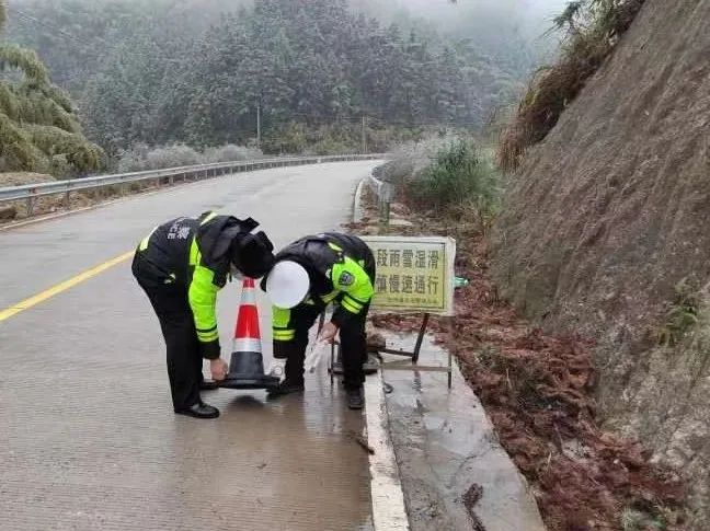 警务人员在危险路段摆放锥筒,坚守路面,及时提醒过往车辆和人员出行安全,对需要帮助的群众及时伸出援手。