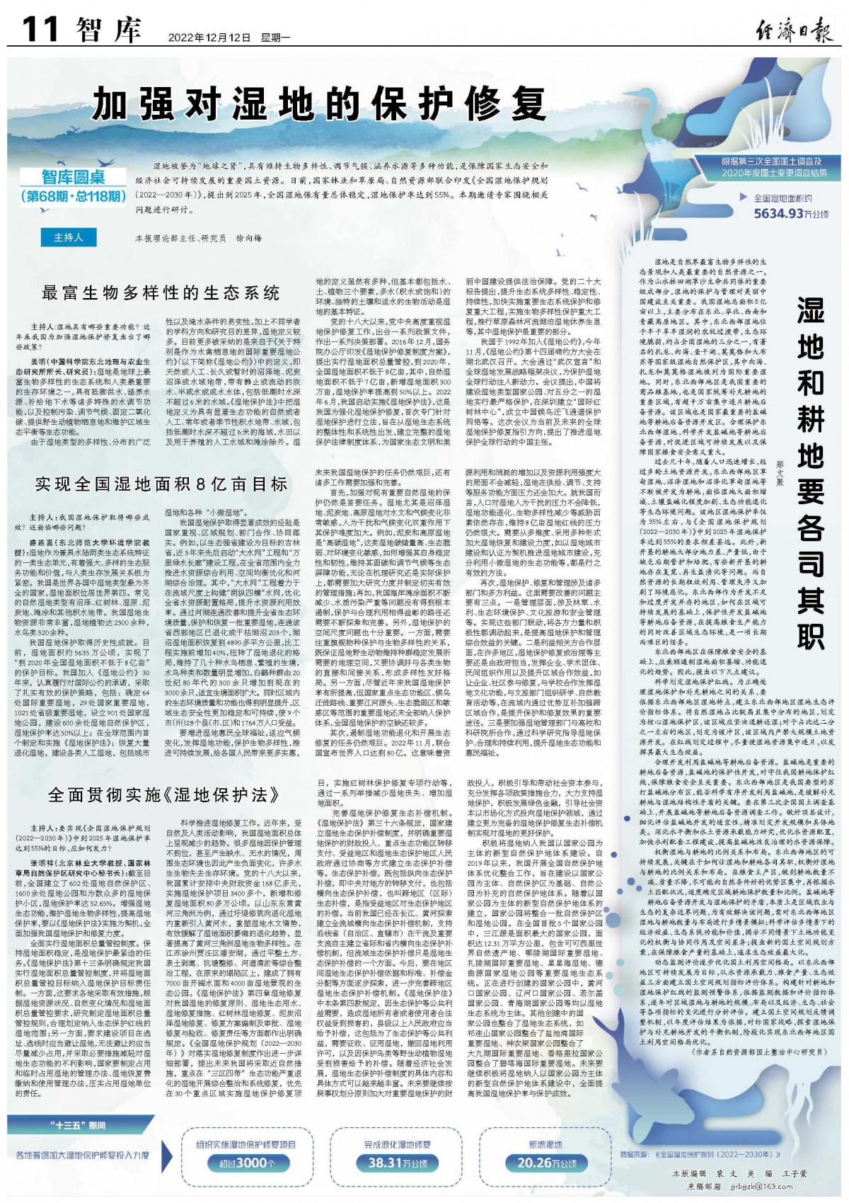 12月12日,经济日报整版聚焦我国湿地保护修复工作,刊发《加强对湿地的保护修复》文章,邀请专家对相关问题进行研讨。文中,东北师范大学环境学院盛连喜教授对“我国湿地保护取得哪些成效?还面临哪些问题?”进行了解答,并以吉林省为例介绍了我国湿地保护取得显著成效的经验。