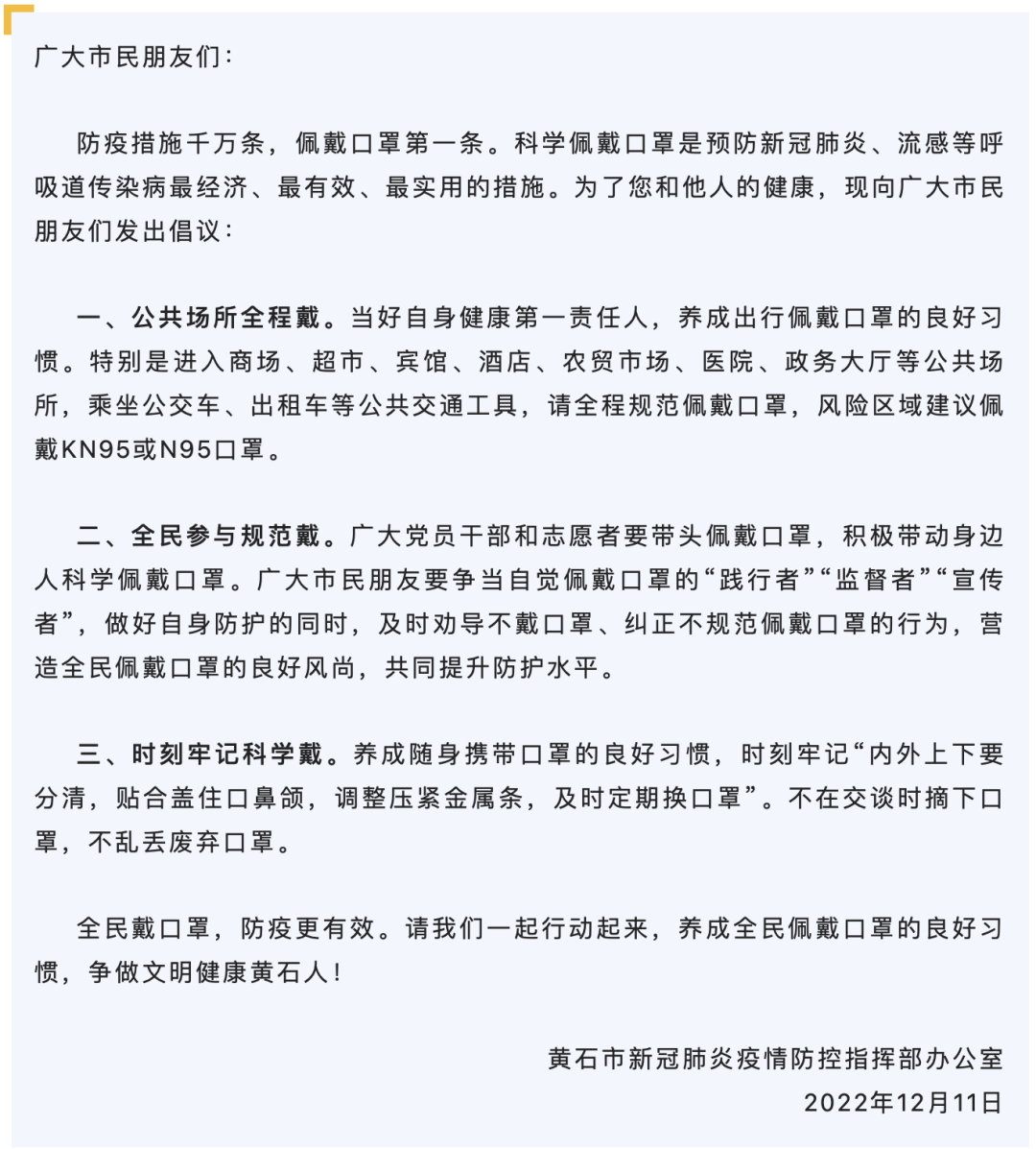湖北黄石市11日发布了《关于全民佩戴口罩的倡议书》,倡议公共场所全程戴、全民参与规范戴、时刻牢记科学戴。