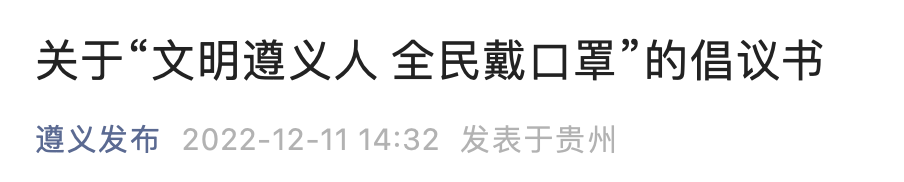 贵州遵义市也在11日发布了《关于“文明遵义人 全民戴口罩”的倡议书》。遵义市卫健局表示:口罩虽薄,能抗疾病;口罩虽小,能显文明;口罩虽轻,能显关心,疫情防控离不开全市人民的参与,让我们一起行动起来,共同养成全民戴口罩的良好习惯,做好个人防护,保护家人健康,助力社会防疫。