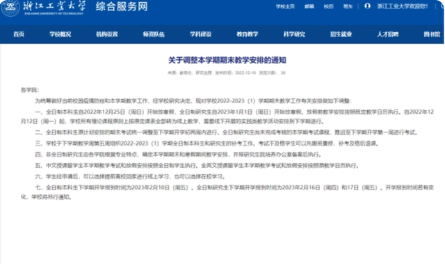 鉴于社会面疫情形势不断变化和学生的实际需求,浙江省内多所高校也在上周末对放寒假和期末考试安排再次做出调整——从通知发布即日起,学生可以请假提前返乡,愿返尽返。同时,所有理论课程按原定课表全部转为线上教学,期末考试统一调整至下学期开学初。
