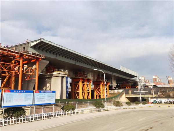 该次顶推采用步履式顶推法施工,是在第一轮顶推拼装节段后方接长58m,历经四天向东跨郑州北编组站下到场多股铁道顶进52米。钢箱梁顶推总吨位约3000吨,相当于推700多头成年大象体重,抵达BP18#墩设计位置。此次顶推施工法具有不影响桥下通行,不干扰铁路车辆正常通行,安全系数高等优点。为确保万无一失,顶推过程中利用智能化监控设备对钢箱梁轴线及高程进行实时监测,一旦出现偏差,实时纠偏。