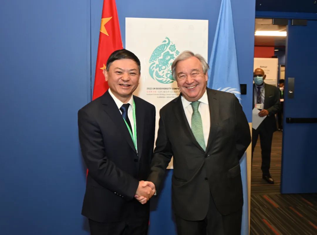 当地时间12月6日,《生物多样性公约》第十五次缔约方大会(COP15)主席、生态环境部部长黄润秋在加拿大蒙特利尔会见联合国秘书长古特雷斯,围绕“2020年后全球生物多样性框架”(以下简称“框架”)磋商进程、推动COP15第二阶段会议取得成功等深入交流。