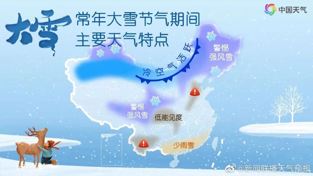 常年来看,大雪期间全国气温显著下降,北方冷空气越发活跃,冬季前沿推进至南岭附近。在冷空气活动的间歇,四川盆地常出现雾或霾天气,能见度较低。