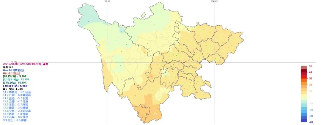 24小时内,盆地最低气温:5~8℃;最高气温:11~13℃。