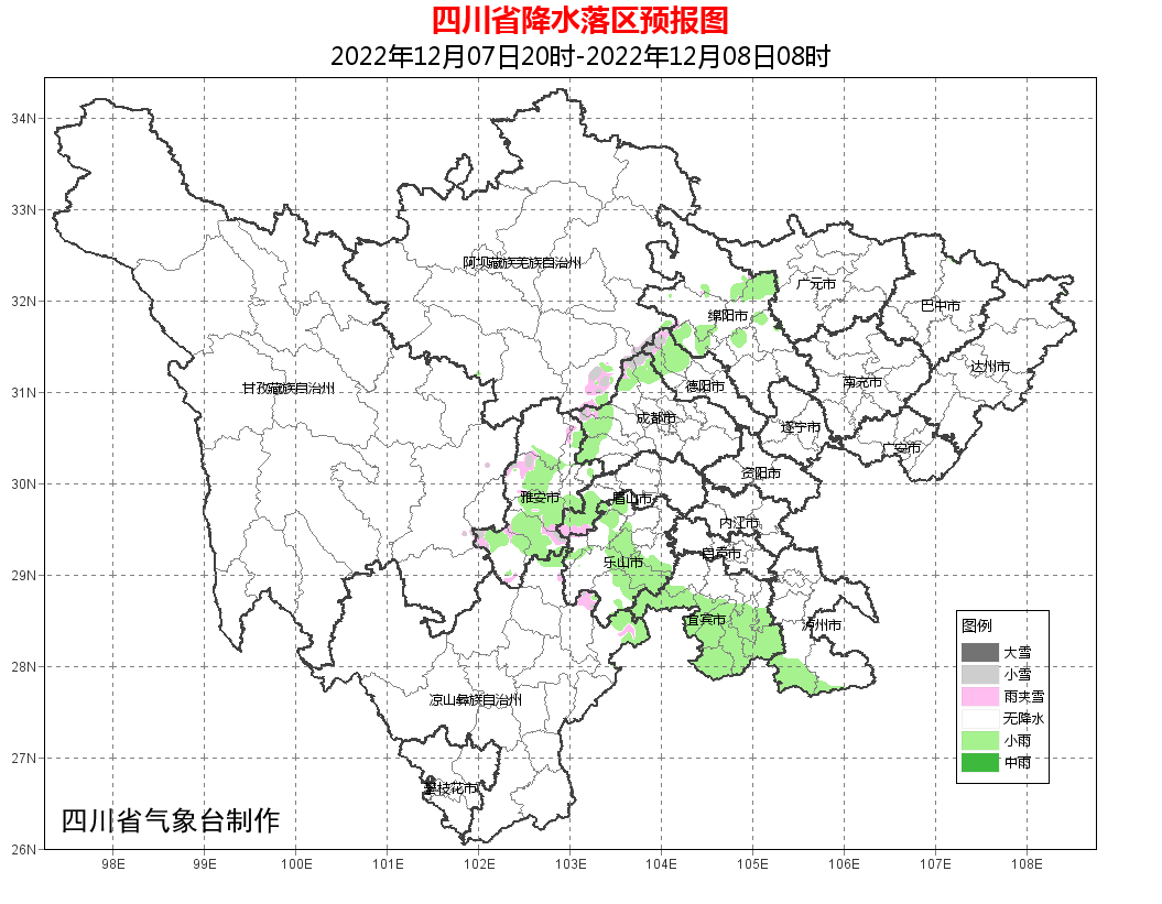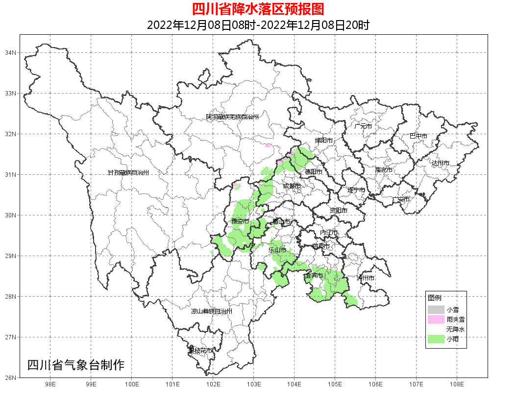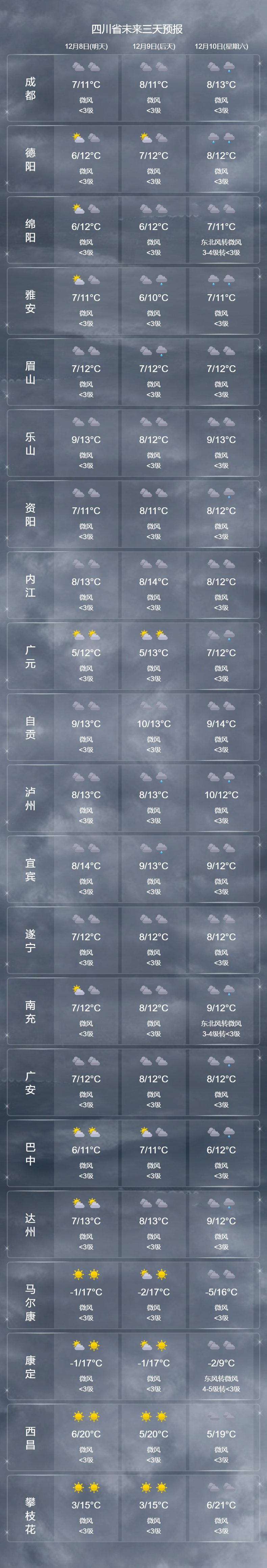 今天晚上:盆地东北部多云间阴,盆地其余地方以阴天为主,其中西部南部山区有小雨或零星小雨,高海拔地区有雨夹雪;川西高原和攀西地区晴间多云。