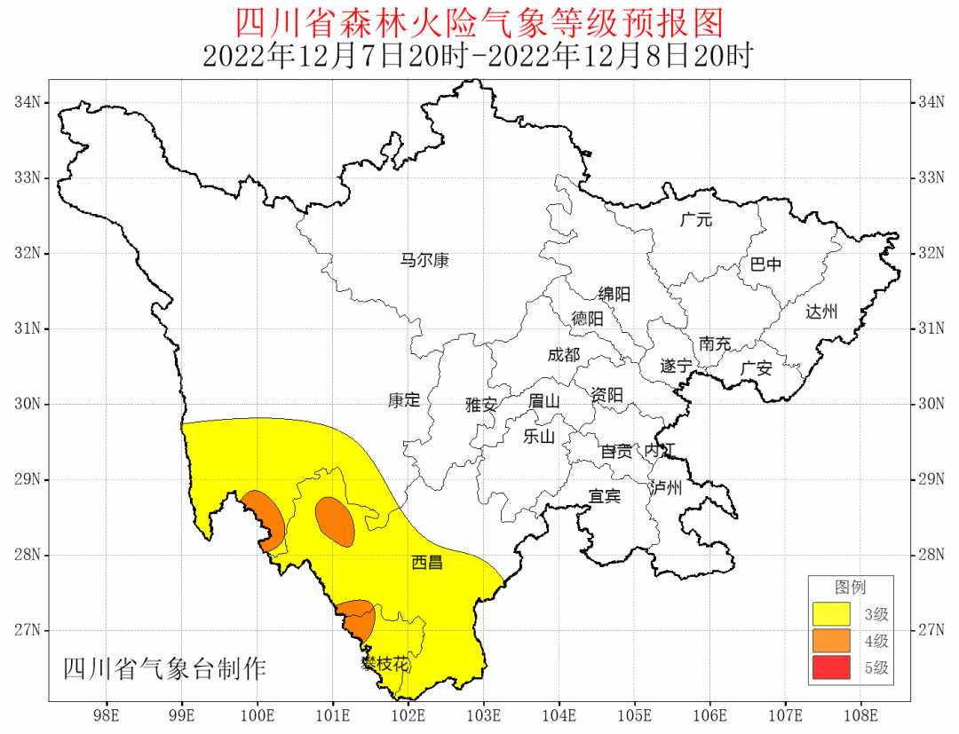 据最新气象资料分析:预计12月7日20时-10日20时,甘孜州南部、攀枝花市、凉山州西部和南部以晴到多云天气为主,空气干燥,森林火险气象等级为3级,局部4级。请相关州市加强火源管理,做好森林防火工作。