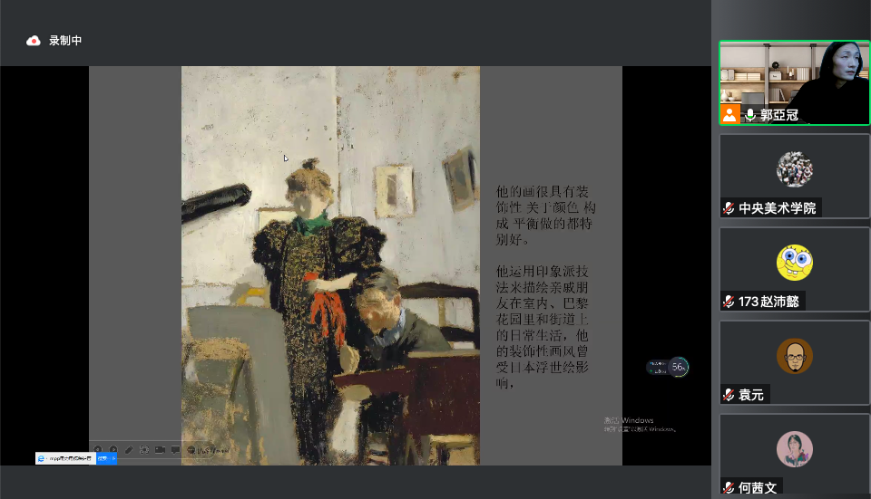来到油画系《色彩表现》的课堂,郭亚冠老师正在讲述欧洲画家博纳尔和图伊曼斯的作品,分析画面中的色彩运用与表现方式。院长范迪安谈到,当代的画家要解决绘画中的时代性、当代性问题。画家会特别敏感于新的形式与图式,以大卫·霍克尼为例,他本人谈及从中国绘画给他的两点启示,一是透视与西方不同,采用近小远大;二是中国人不画影子,解放了画面空间。又如比利时画家图伊曼斯,他先是解决摄影图像和绘画的关系问题,同时还注重社会性因素。他说,中央美院从来不是以培养技术型专家为骄傲,而是要培养全面的人才,需要提供更全面的修养、更有思辨力的研究,形成长期的学养。副院长林茂表示,为了上好线上课,让学生有更多的收获,老师们精心准备,想办法保证课程质量,希望同学们用心体悟老师讲的课程讲授,把思考体会贯穿到自己的创作中去。