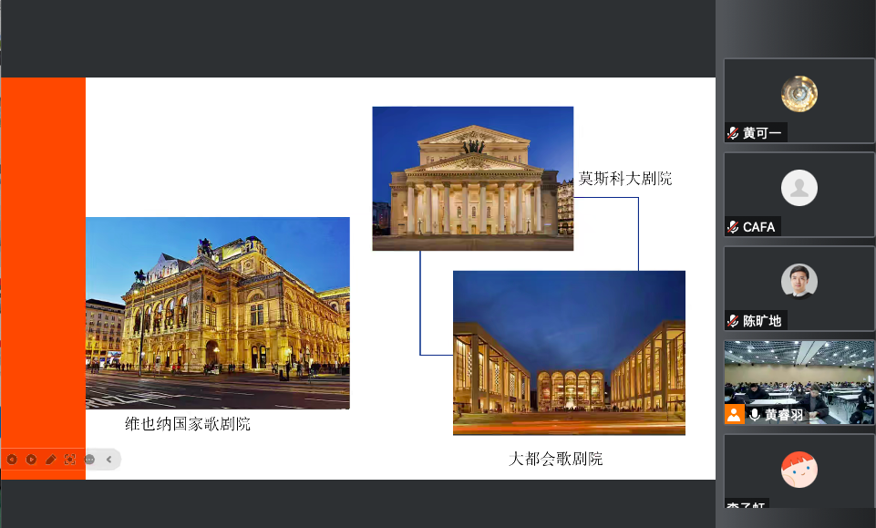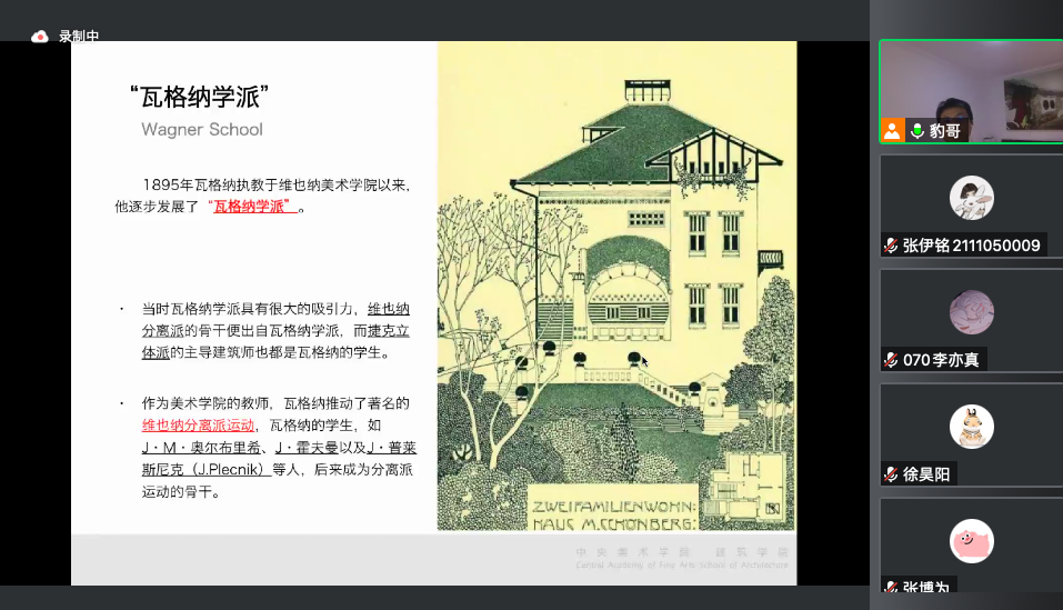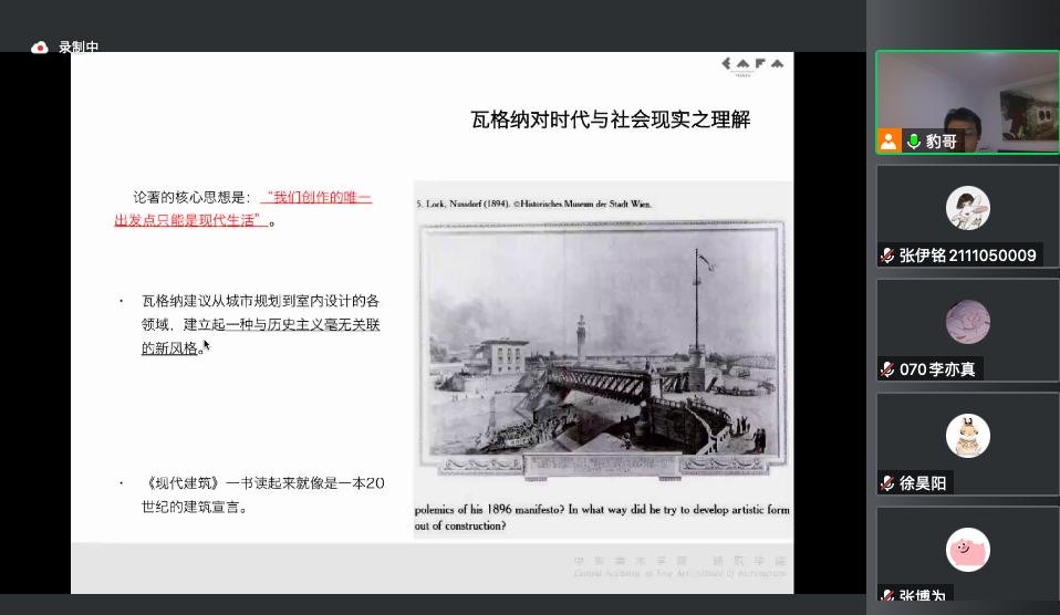 建筑学院刘文豹老师的《世界近现代建筑史1》课堂上正在讲瓦格纳对维也纳新城的规划设计。院长范迪安表示,“一周前,我还在教室里和建筑学院工作室的同学们在交流。转入线上教学是新的挑战,全院上下克服困难,把线上教学开展更扎实、更生动。刘文豹老师的课不仅内容丰富,且讲授有深度。中央美院的建筑教学理念,既要充分吸收借鉴国际建筑历史实践有利经验,也要立足中国社会文化进行思考,培养‘理技兼备’的艺术人才,办出央美特色”。