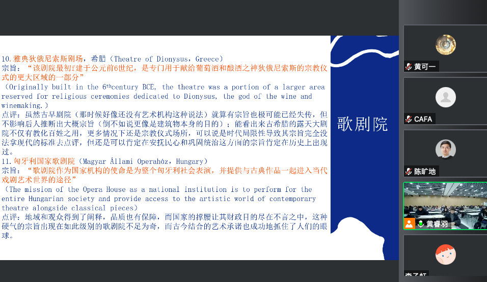 中法学院(上海)的黄睿羽老师在《艺术管理学概论》课堂上与同学们分享国外歌剧院机构管理的案例。范迪安院长表示,“通过对国外的文化机构、艺术机构案例研究,能够让同学们对世界优秀的文化遗产有更多领会,从而建立更宽广的知识基础,由此通往具体课题研究,也希望同学们从积累到研究,能够多加思考,建立起学理性逻辑结构。”听课的校领导非常关心地处上海的中法学院的师生教学与学习生活,与师生进行了热情交流,并表示期待春暖花开,与大家相聚上海校区。