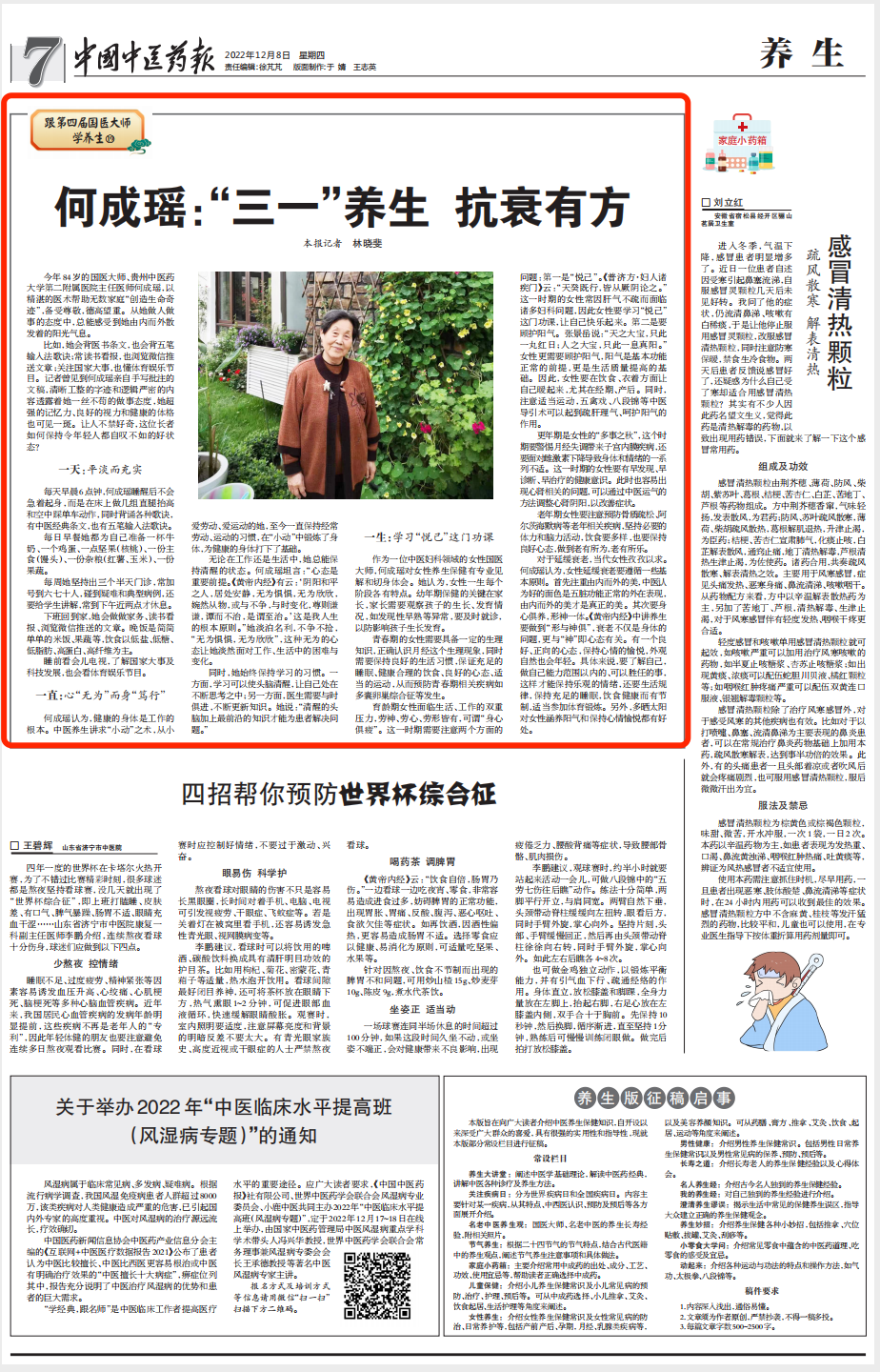 作为一位中医妇科领域的女性国医大师,何成瑶对女性养生保健有专业见解和切身体会。她认为,女性一生每个阶段各有特点。幼年期保健的关键在家长,家长需要观察孩子的生长、发育情况,如发现性早熟等异常,要及时就诊,以防影响孩子生长发育。