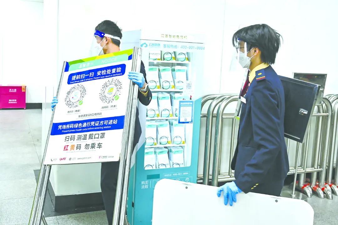 12月7日晚,广州市地铁工作人员撤除体育西路地铁站入站口的健康码扫码指引。当晚,乘客进入广州地铁车站时,无需扫车站场所码及出示健康码。(图片来源:视觉中国)
