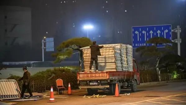 12月7日,西安绕城高速出入口核酸查验岗点撤除,工人们将隔离栏架搬上货车运走。(图片来源:人民视觉)