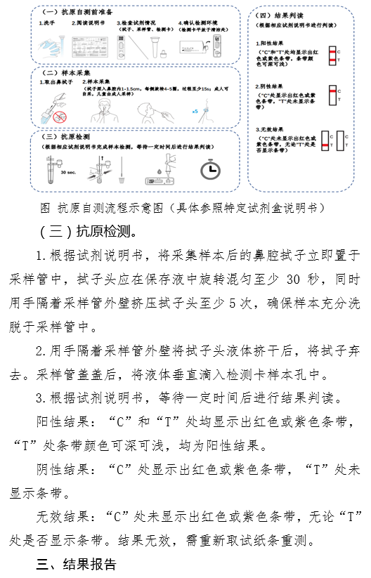 (三)注意事项。自我检测时可以按照说明书示意的要求和流程进行检测和结果判读,也可以联系基层医疗卫生机构签约服务医务人员,在其远程指导下完成抗原检测。