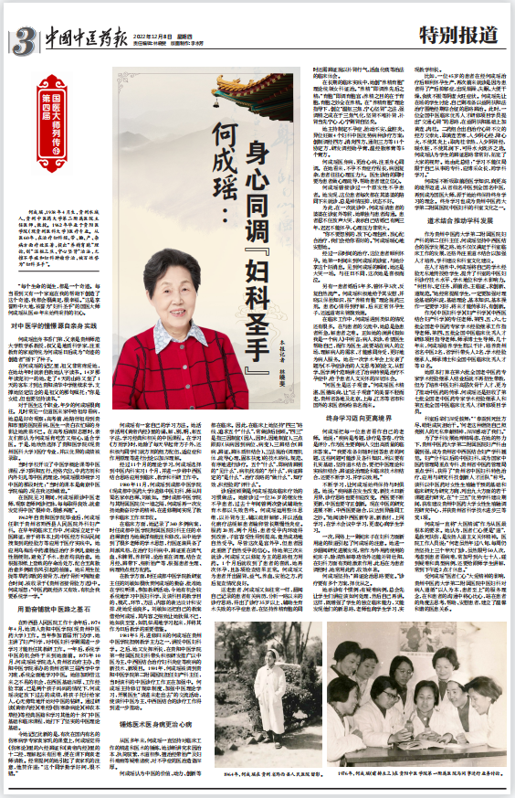 作为贵州中医药大学第二附属医院妇产科的第二任科主任,何成瑶坚持中西医结合的医学发展之路,她不仅仅满足于科室临床工作的发展,还格外注重道术结合以加强人才培养、学科建设和科室文化建设。