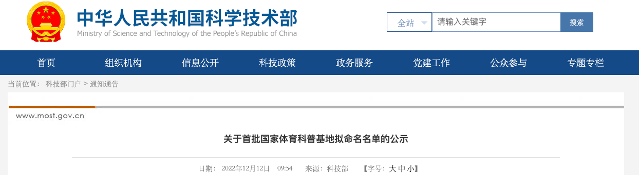 2022年2月,国家体育总局和科学技术部联合启动国家体育科普基地申报与评审工作。该项目希望通过统筹规划、合理布局,建成一批面向公众开展体育科技知识普及、宣传体育科技成就、推广科学健身知识、提高全民健康素养的国家体育科普基地,在开展社会性、群众性、经常性的体育科普活动中发挥示范引领作用,进一步满足人民群众期盼和国家体育事业发展需要。