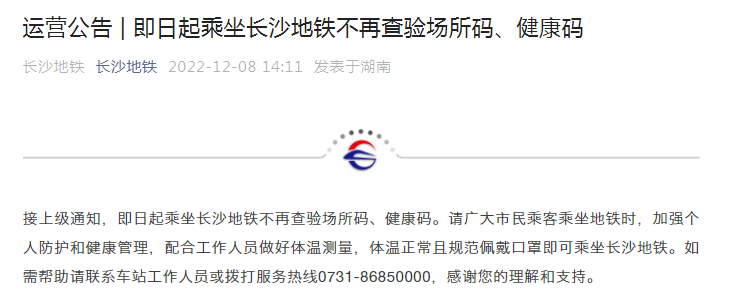 据长沙地铁消息,接上级通知,即日起乘坐长沙地铁不再查验场所码、健康码。请广大市民乘客乘坐地铁时,加强个人防护和健康管理,配合工作人员做好体温测量,体温正常且规范佩戴口罩即可乘坐长沙地铁。如需帮助请联系车站工作人员或拨打服务热线0731-86850000,感谢您的理解和支持。