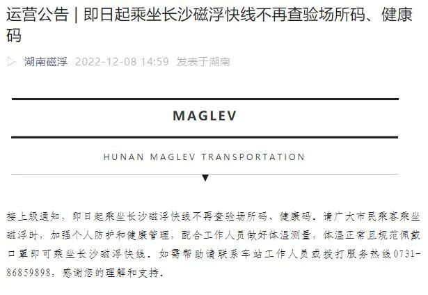 湖南磁浮发布运营公告:“接上级通知,即日起乘坐长沙磁浮快线不再查验场所码、健康码。请广大市民乘客乘坐磁浮时,加强个人防护和健康管理,配合工作人员做好体温测量,体温正常且规范佩戴口罩即可乘坐长沙磁浮快线。如需帮助请联系车站工作人员或拨打服务热线0731-86859898,感谢您的理解和支持。”