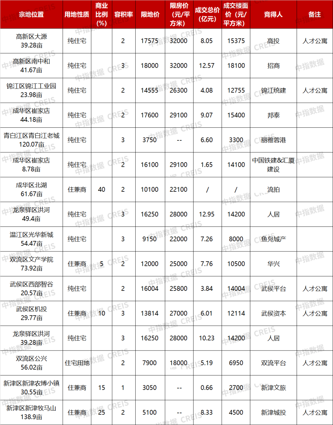 其中1宗位于成华区龙潭街道61亩宗地因无人报名而流拍;仅1宗地块溢价成交,也是此次唯一达到最高土地限价的地块。该地块位于高新区中和街道的41.7亩纯住宅用地,在本土中起拍价最高,同时也是成交楼面价和住宅清水限价最高的地块。
