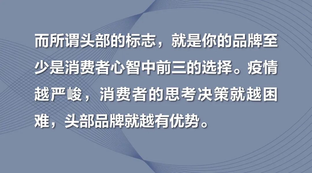 而所谓头部的标志,就是你的品牌至少是消费者心智中前三的选择。疫情越严峻,消费者的思考决策就越困难,头部品牌就越有优势。