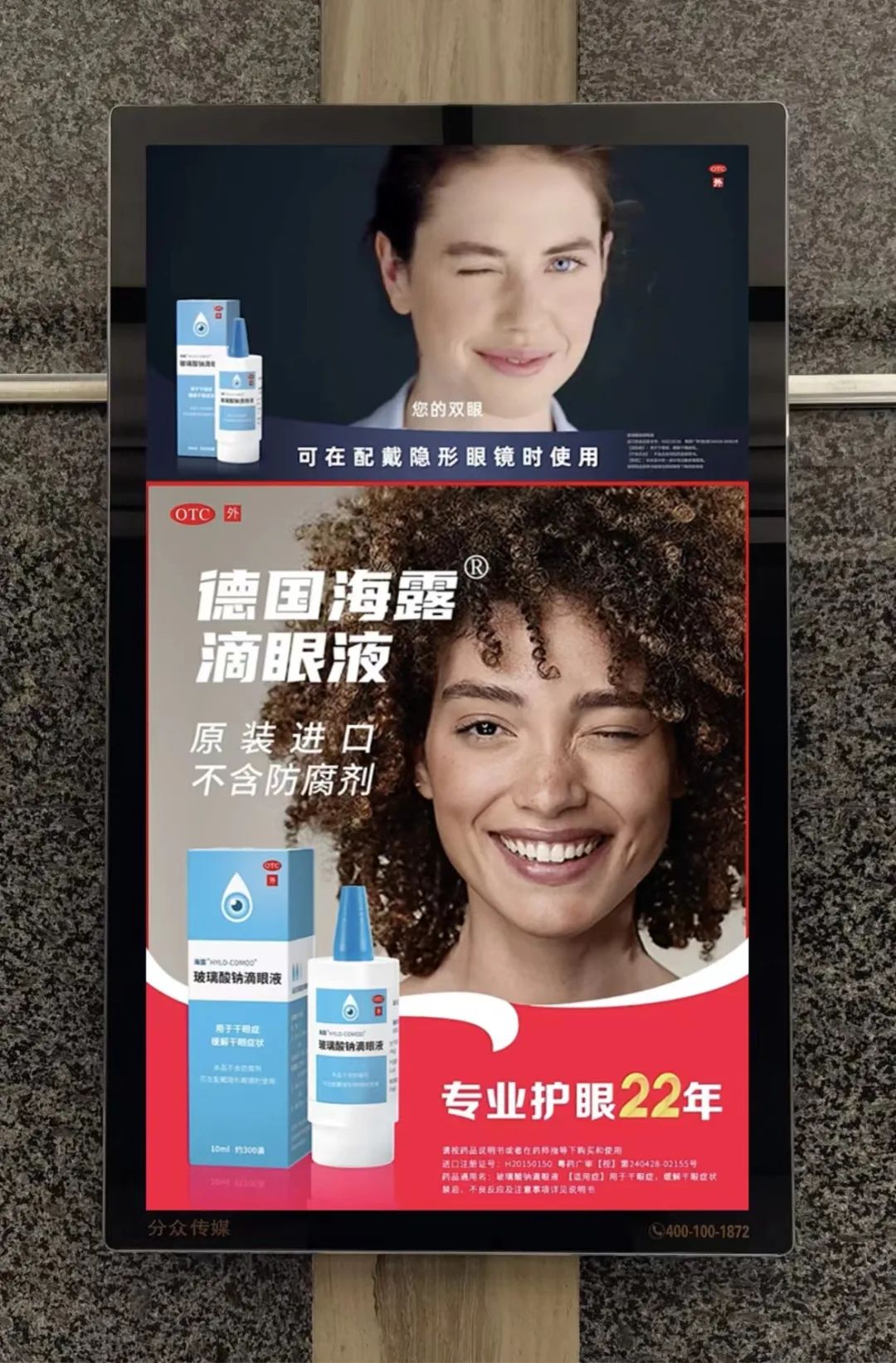 又比如同样霸屏分众的蔓迪抓住了中国脱发人数超过2.5亿的巨大机遇,高频反复提示,所以蔓迪成为京东健康的OTC类(非处方药)的TOP1,而与之类似同样都是刚需大品类,如在治疗干眼症中广为人知的德国海露。