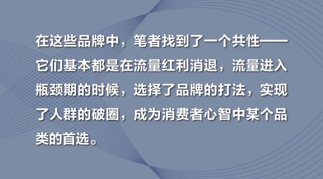 在这些品牌中,笔者找到了一个共性——它们基本都是在流量红利消退,流量进入瓶颈期的时候,选择了品牌的打法,实现了人群的破圈,成为消费者心智中某个品类的首选。