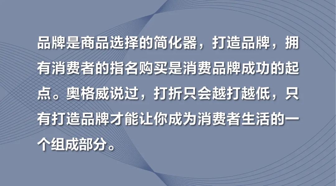 品牌是商品选择的简化器,打造品牌,拥有消费者的指名购买是消费品牌成功的起点。奥格威说过,打折只会越打越低,只有打造品牌才能让你成为消费者生活的一个组成部分。
