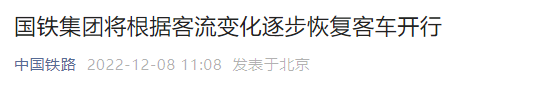 中国国家铁路集团有限公司迅速贯彻落实国家优化疫情防控新十条措施,在取消乘火车出行查验48小时核酸阴性证明和健康码的基础上,密切关注各地疫情防控政策变化,运用12306查询、购票大数据精准分析客流走势,做好客车上线准备工作,根据市场需求逐步恢复列车开行,充分满足旅客出行需求。