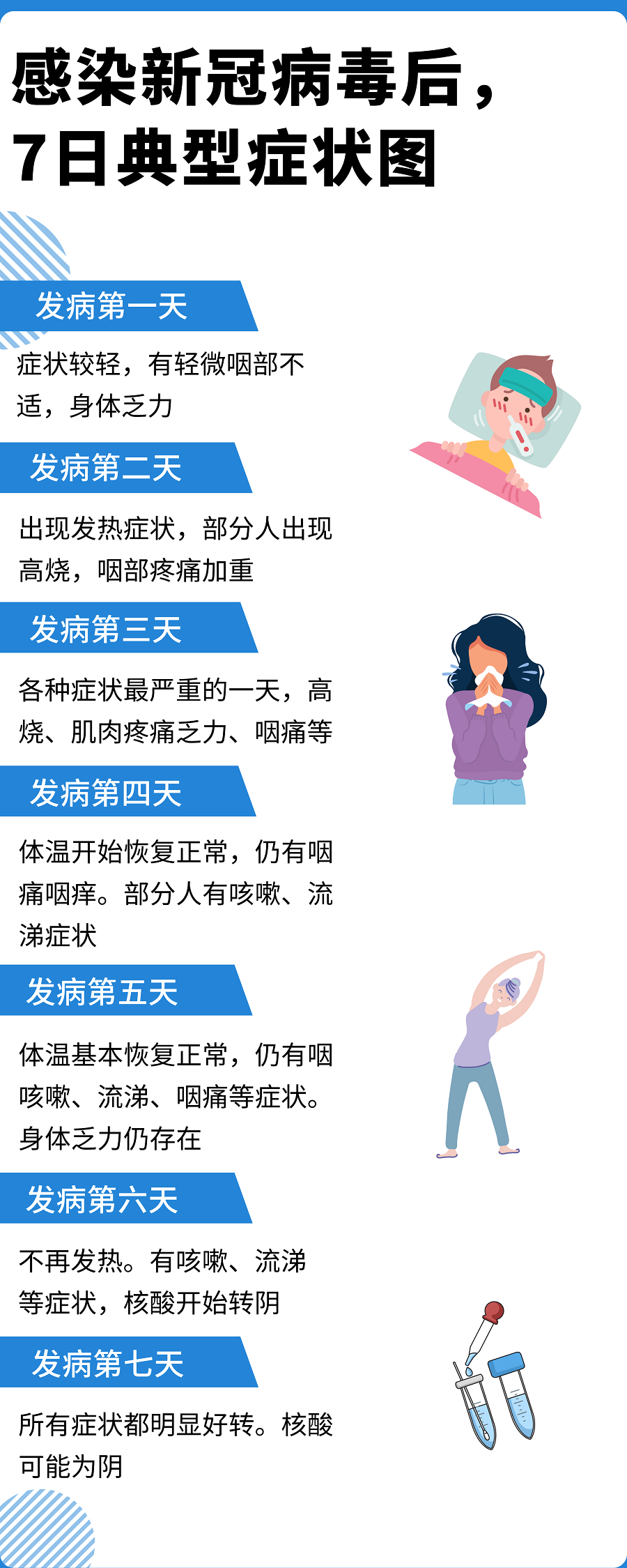 首先,新冠发病后,的确症状会有所不同,我们就参照已披露的信息,来看看感染发病1周内,可能逐步出现哪些症状[1]。