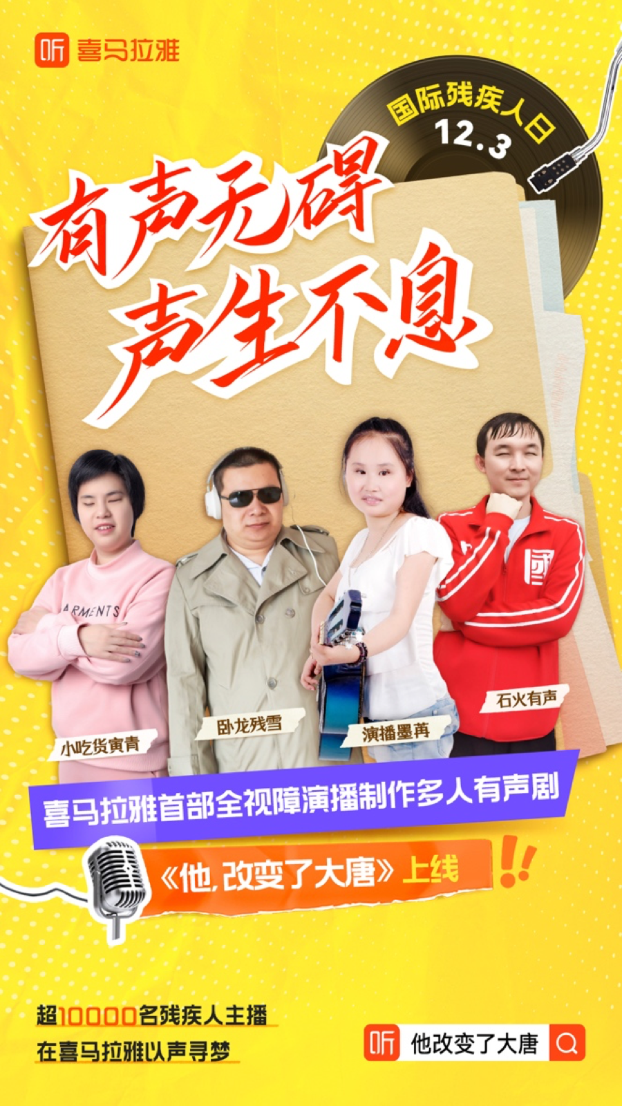 在喜马拉雅上,残疾人主播已超过10000名,他们或演播有声书、或开语音直播、或创作播客,或从事和有声相关的如画本、后期、对轨、审听等工作。声音助力他们跨越身体障碍,也让他们获得多元职业选择、实现自我价值的同时也更好地融入了社会。