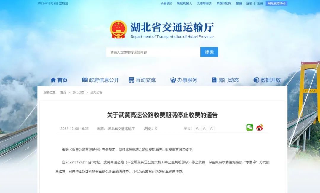 自2022年12月11日0时起,武黄高速公路(不含鄂东长江公路大桥3.98公里共线部分)停止收费,保留既有收费设施按照“零费率”方式照常运营,对通行本路段的所有车辆免收车辆通行费,并代为收取其他路段的车辆通行费。