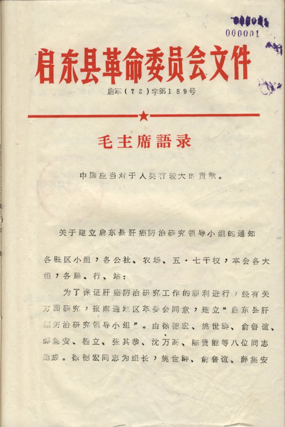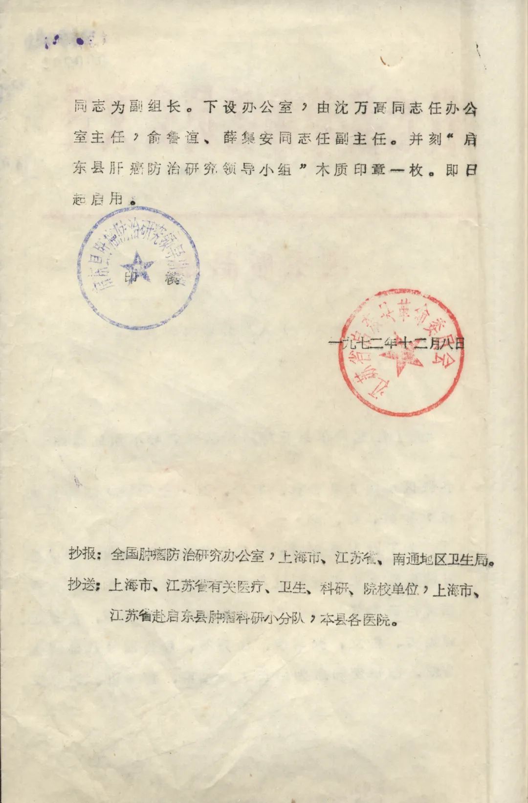 1972年12月8日,“启东县肝癌防治研究领导小组”成立