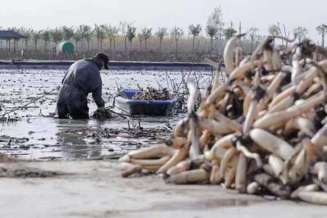12月13日,工作人员正穿着防水服,下到水齐腰深的荷塘中,驾驶着挖藕机,将一根根嫩白的莲藕从水下缓缓抽出,堆放在蓝色的小船上,然后分拣、清洗、加工,一派繁忙的丰收景象。