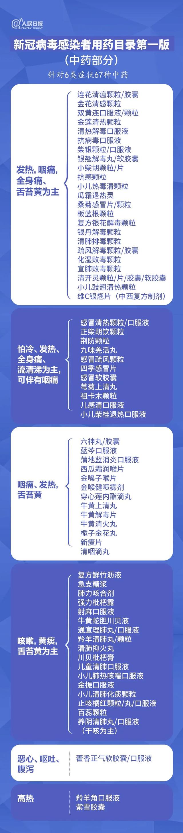此版用药目录按照中西药分开的原则,是对国家第九版诊疗方案中推荐用药的完善和补充,针对发热、咽痛等6类中医诊断症状推荐67个中药品种;针对咳嗽、咳痰等4类临床症状推荐41个西药品种。