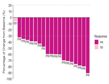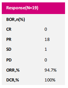 研究结果显示:截止2022年11月20日,27名患者(Ⅰb期DL2,n=6;Ⅱ期,n=21)入组并接受治疗,索凡替尼的Ⅱ期试验推荐剂量(RP2D)确定为200mg。在目前19例疗效可评估的患者中,18例达到PR,1例达到SD(图2),ORR达94.7%,DCR为100%(表1),中位PFS、OS尚未达到。
