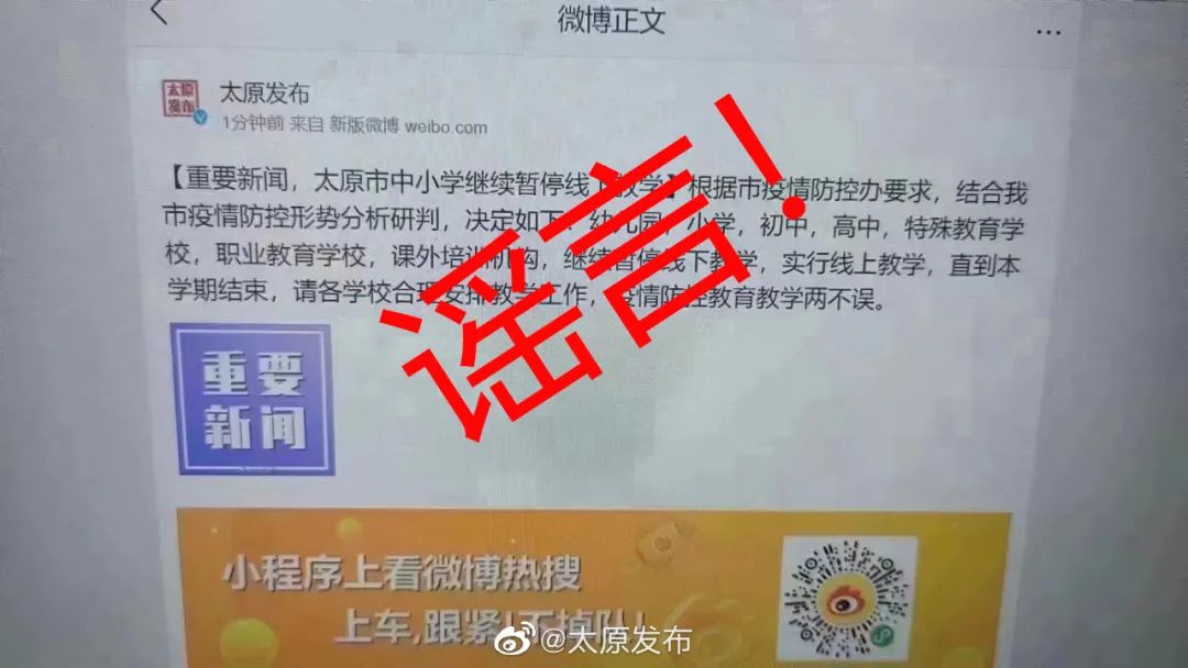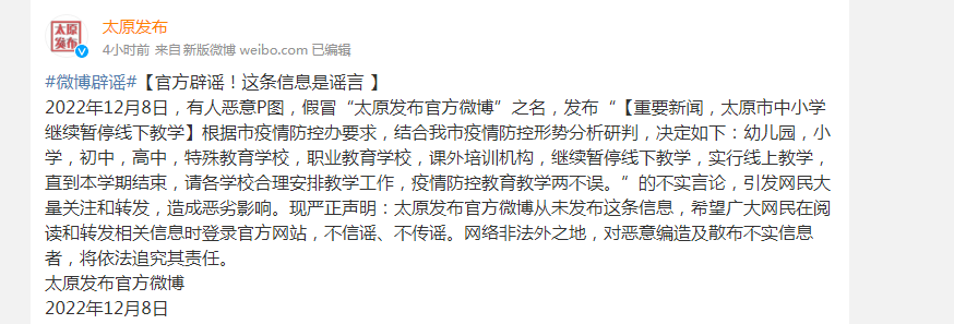 2022年12月8日,有人恶意P图,假冒“太原发布官方微博”之名,发布“重要新闻,太原市中小学继续暂停线下教学根据市疫情防控办要求,结合我市疫情防控形势分析研判,决定如下:幼儿园,小学,初中,高中,特殊教育学校,职业教育学校,课外培训机构,继续暂停线下教学,实行线上教学,直到本学期结束,请各学校合理安排教学工作,疫情防控教育教学两不误。”的不实言论,引发网民大量关注和转发,造成恶劣影响。现严正声明:太原发布官方微博从未发布这条信息,希望广大网民在阅读和转发相关信息时登录官方网站,不信谣、不传谣。网络非法外之地,对恶意编造及散布不实信息者,将依法追究其责任。