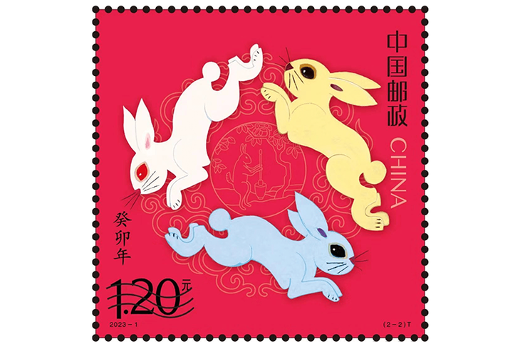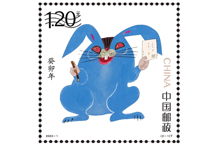 第一枚名为“癸卯寄福”。用别出心裁的蓝色,描绘了一只右手执笔、左手持信的睿智卯兔。