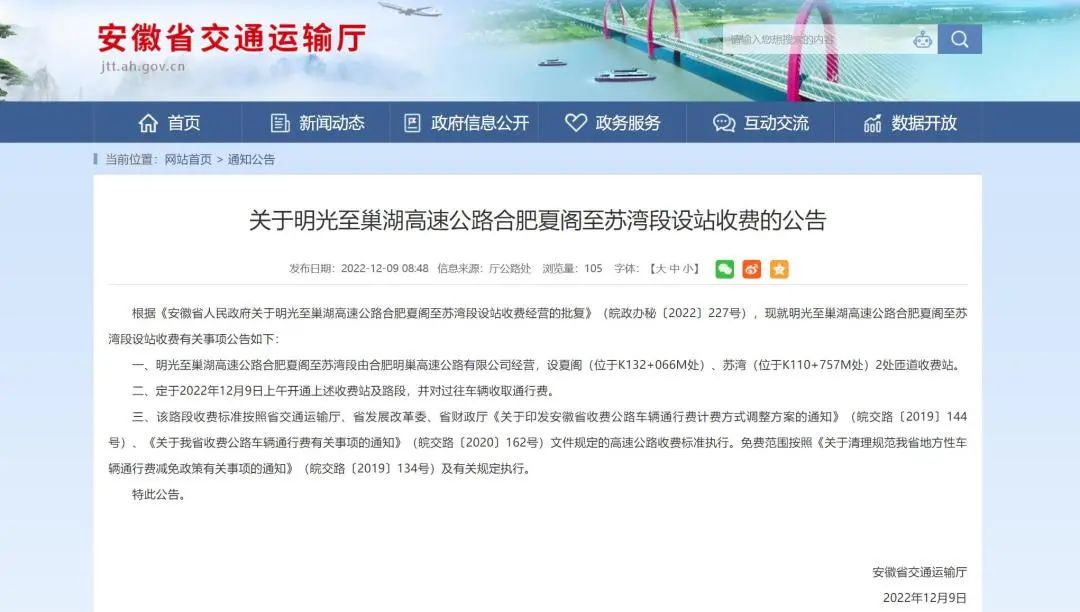 12月9日,省交通运输厅发布《关于明光至巢湖高速公路合肥夏阁至苏湾段设站收费的公告》
