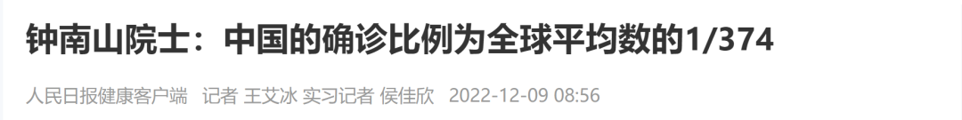 据钟南山院士提供的数据显示,截止到2022年11月28日,中国的确诊比例为全球平均数的1/374,确诊比例为美国的1/1348,死亡比例是全球平均数的1/232。