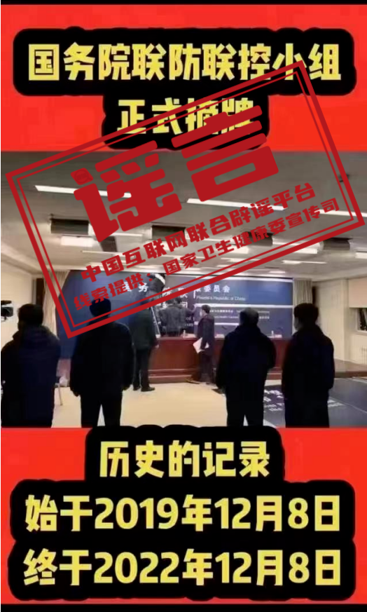 12月8日,网传“国务院联防联控小组正式摘牌!”,称“历史的记录,始于2019年12月8日,终于2022年12月8日”,煞有其事的谣言以讹传讹,引发“国家疫控政策重新调整”“联防联控小组解散了,意味着疫情结束了”等种种臆测。