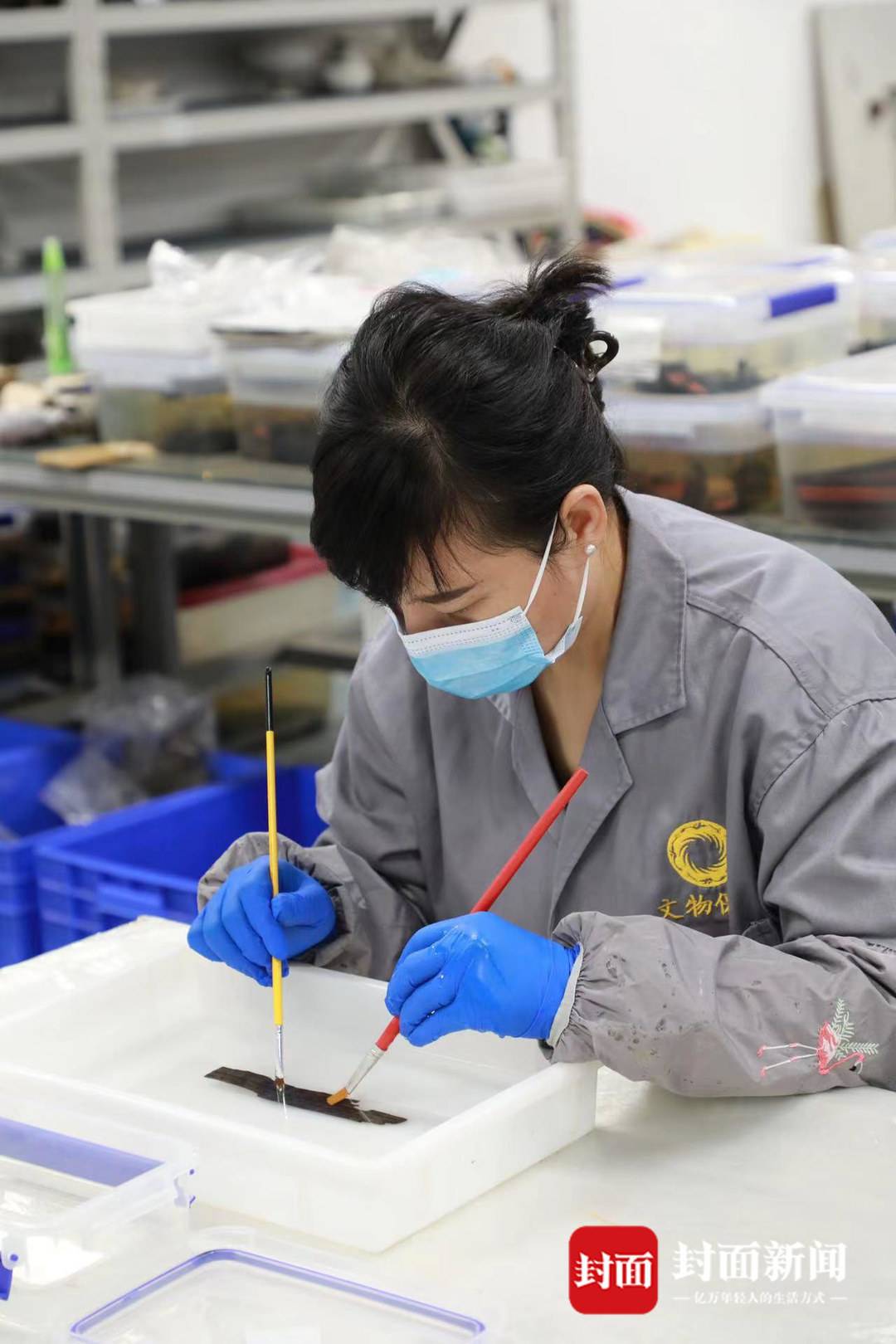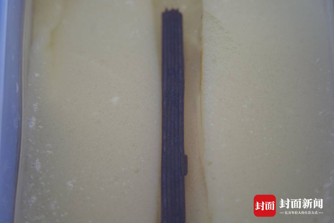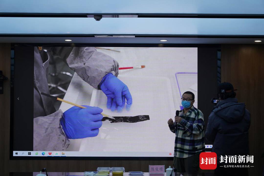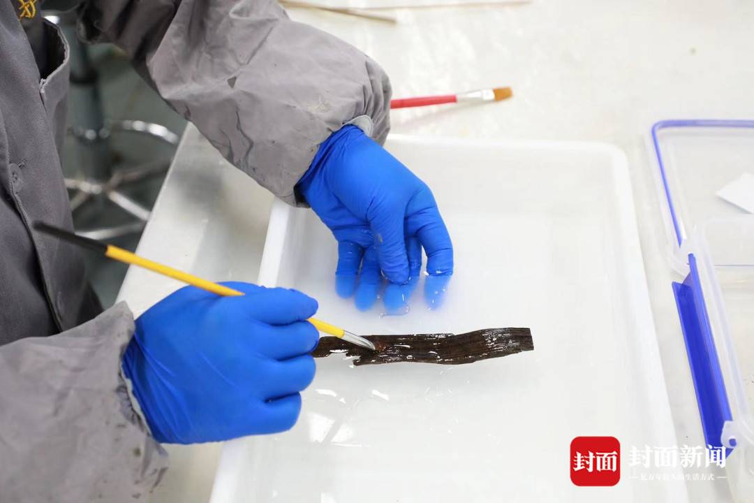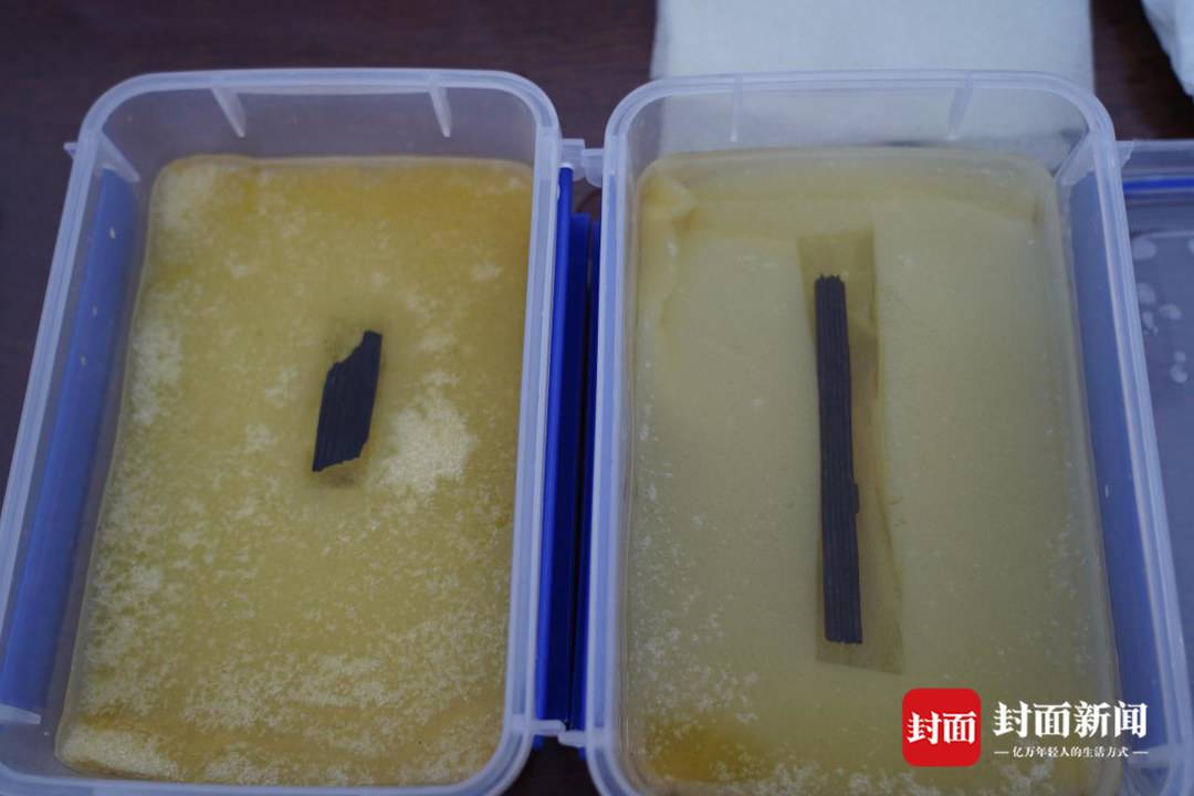 当天上午展示的秦简就发现于冶铸废弃堆积内。成都文物考古研究院90后文物修复师陈俊橙向媒体展示了浸泡在蒸馏水中的两片简牍,其中一片简牍上清晰可见“成都”二字,另一片木牍上能辨认出“西工师”等字迹。